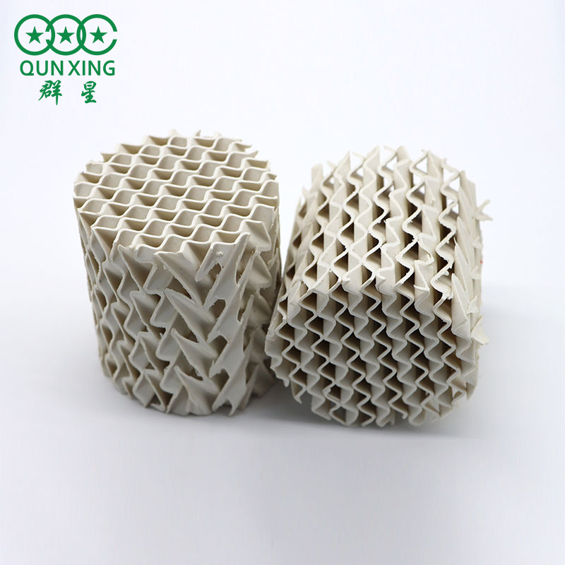 4.陶瓷孔板波紋填料金屬、塑料波紋填料具有優(yōu)良的技術(shù)經(jīng)濟性能,但對于高溫(~500℃)和腐蝕性介質(zhì)的蒸餾、吸收等分離,顯然不能勝任。而陶瓷孔板波紋填料不J具有波紋填料優(yōu)良的綜合性能外,還具有陶瓷的耐酸、堿腐蝕性和良好的表面潤濕性能,又耐高溫和低溫,適用于較強腐蝕性物系的物料分離。陶瓷的造價也比較便宜。匯總起來,陶瓷孔板波紋填料的主要適用范圍是: